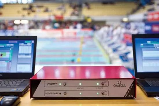 图1 绿茵场上的Big Bang腕表型计时牌 游泳比赛中的“量子计时器” 游泳比赛中有很多平局,如果计时足够精确,那么运动员触壁时间绝对不可能完全一样。2008年北京奥运会,场馆计时的技术人员多达700名,各种器材重达400吨,此次奥运会男子100米蝶泳决赛是经过后备电脑和水上、水下录像全方位反复分析后才得出了结果。 如果使用了量子计时器,再出现同样的情况,裁判就不用这么头疼了。 量子是构成物质的基本单元,能量最基本携带者,通过捕获单个原子、电子、或其他微观粒子制造的高精度计时器就是量子计时器。几乎找不出一个体育项目,是它无法计时的。 2012年伦敦奥运会、2016年里约奥运会的游泳项目使用量子水上运动计时器。游泳比赛依旧以百分秒来确定选手成绩,背后却依靠强大精准的计时器作为凭证,让选手心服口服。奥运会中的量子计时器是包括装置于此计时器主体之内、支持其精准运作的一整套系统,它拥有16个独立计时器、128个输入端及32个输出端,功能极为强大,通过在起跳台、电笛讯响发令器和触摸板设施来实现精准计时。 量子计时器及量子水上运动计时器精度达到了千万分之一秒,使比赛时间精确到微秒,不夸张地说,比眨一下眼还要快,眨眼大约需要350,000微秒时间。