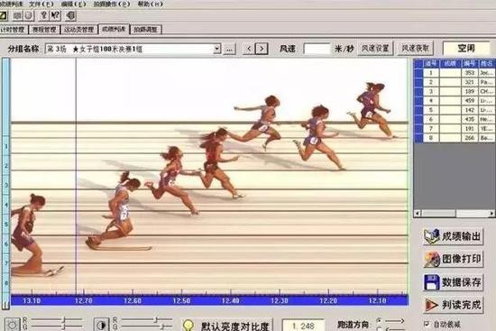 图7 1948年伦敦奥运会上使用的终点摄影机 如今奥运会田径比赛起跑、冲线、显示成绩、电视直播等一整套流程都需要更加精准的计时系统。国内外田径比赛计时方法主要有终点电子计时摄像和射频识别计时技术。 终点电子计时摄像——短跑计时神器 发令枪响,连接在发令台上的传感器同时启动高精度计时器,运动员接近终点线时, CCD高速数字摄像机以1ms/帧的速度连续拍摄运动员冲刺图像,经图像处理后存入计算机并叠加上时标,裁判通过移动鼠标来判读每个运动员的成绩,计算机自动排名并生成分组成绩表,输送至比赛大屏幕显示器。
