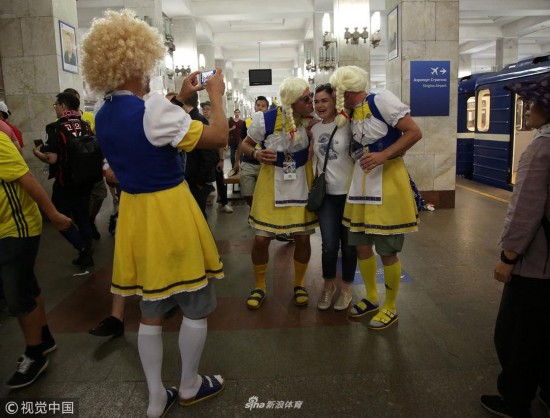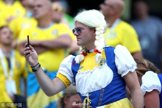 2018年6月18日,俄罗斯下诺夫哥罗德,2018俄罗斯世界杯小组赛F组,瑞典1-0韩国。 瑞典队男性球迷穿女装加油助威