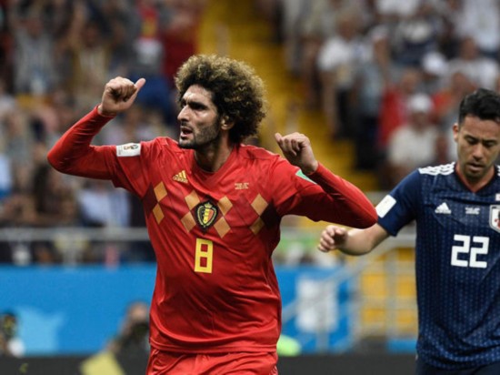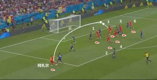 从高清图可以看到,米纳是角球进攻中,唯一充分起跳的球员 如果说英格兰的角球战术中,关键点是中锋凯恩和中卫斯通斯的话。那么哥伦比亚这边,角球战术的重点就是中卫米纳和中锋法尔考。由于定位球战术下,球员的角色相对模糊,中卫和中锋是相等的概念,这也使得米纳连续3场比赛通过角球战术破门。 从高清图上可以看到,当时哥伦比亚6名球员成直线在中路位置,真正起跳的,是身高最高的米纳。这种战术的目的,就是要限制防守人起跳,最终利用高点破局。 什么!0-2了?上费莱尼,给我砸高球! 更为经典的故事,发生在日本与比利时的比赛之中。当时日本队通过极为精彩的肋部防守和反击进攻,一度赢得了2-0的领先优势。不过随后比利时放弃了默滕斯、阿扎尔双前腰结合两侧翼卫打肋部的思路,直接换上大个子的费莱尼和查德利,进行高空轰炸。