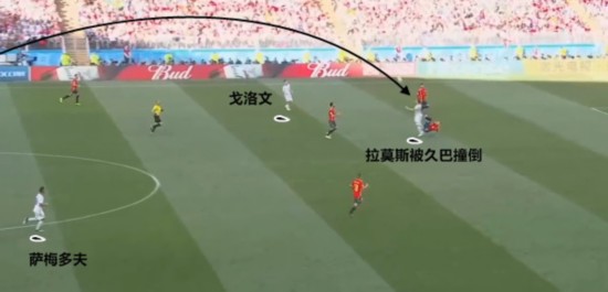 久巴顶翻拉莫斯,第一点拿球交给戈洛文发动进攻 在那场西班牙人完成79%控球,以及1146次传球的“史诗”之战中,俄罗斯人就是用这样一种长传找久巴的方式完成推进。戈洛文及时跟进,形成了很好的呼应。