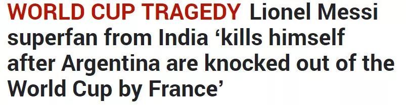 根据英国《太阳报》报道,本次世界杯的悲剧之一,是有一位来自印度的超级粉丝,在阿根廷3-4输给法国无缘世界杯8强之后抑制不住悲伤,竟在家中选择上吊自杀。