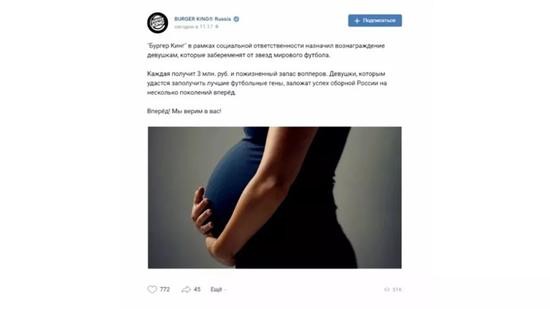 美国连锁品牌Burger King(汉堡王)俄罗斯分部在世界杯开赛之初曾打出广告,表示将为怀上世界杯球员孩子的俄罗斯女性提供47000美元的奖金,以及终身免费的Whopper大汉堡。