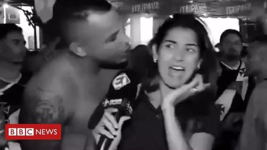 在今年3月的南美解放者杯上,巴西一位女记者也在直播中被一个裸着上半身的男子强吻了嘴巴。