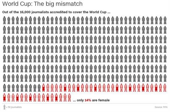 根据国际足联官方数据,在2018俄罗斯世界杯官方认证的16000名记者中,仅14%是女性。