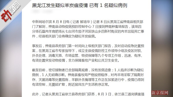 据中国新闻网8日报道,黑龙江桦南县桦南种畜场一肉羊育肥场购买的肉羊出现死亡事件,疑羊炭疽病。目前羊群扑杀掩埋等工作正在加紧进行,疫情已有效控制,无蔓延扩散。什么是炭疽病?专家称这是一种由炭疽杆菌引起的人畜共患急性传染病,人类因直接或间接接触病畜才会发生感染,早发现早治疗,治愈率很高。