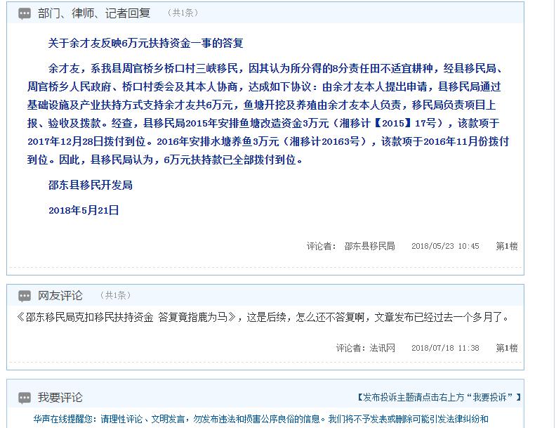 5月20日,法讯网发布《湖南邵阳市邵东县移民局克扣移民改造资金》,之后搜狐、凤凰网等几十家网站转发,引起强烈反响。邵东县移民局给撰稿人及在湖南日报、华声在线、《新湖南》主办的“投诉直通车”的答复是这样的: