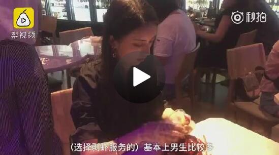 上海一家餐厅推出专人剥虾服务,老板称一些顾客边吃龙虾边玩游戏,于是招募了剥虾员工,加收15%服务费。兼职大学生小何说,“选择剥虾服务的基本上是男生,努力的话,一个月工资大概会达到五位数”。