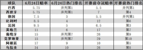 腾讯体育6月25日讯 截止今晨,世界杯小组赛第二轮全面结束。根据博彩公司更新的夺冠赔率,巴西、西班牙成为冠军最大热门,英格兰、比利时、葡萄牙、克罗地亚等队的夺冠热度上升,阿根廷、德国的热度下滑。