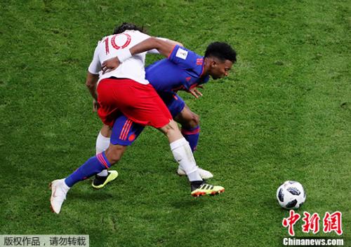 比赛瞬间。 中新网6月25日电 北京时间25日凌晨,2018俄罗斯世界杯H组次轮波兰与哥伦比亚的比赛在喀山打响。哥伦比亚队全场凭借米纳、法尔考和夸德拉多的进球3比0完胜波兰队,取得3分的同时也将波兰队提前送走出局。 由于波兰和哥伦比亚在首场比赛中均负于各自对手,只积0分的他们在小组赛第二轮展开殊死搏斗。如果在第二轮再输球的话很可能就会被提前淘汰出局,因此两支球队肯定都会全力以赴。 对哥伦比亚队而言,首战告负多少有些意外。在开局3分钟内被红牌罚下一人、先失一球,落败已被埋下伏笔。因伤缺席了上届杯赛的“老虎”法尔考奉献了他的首秀,成为哥伦比亚队最活跃的人物。J罗作为上届金靴,本场能否发挥作用值得期待。 波兰队的首战告负则是咎由自取。如果说他们成全塞内加尔队率先得分的乌龙球情有可原的话,那个成为对方进球助攻的传球则完全是低级失误。如今看来,仍然高居世界第八的他们确实有些名不符实。 波兰和哥伦比亚此前有5次交锋,波兰2胜3负处于下风。两队最近一次交锋要追溯到2006年,当时哥伦比亚2-1取胜。 开场伊始哥伦比亚队迅速掌握场上主动,他们不断通过J罗的中场梳理,夸德拉多与法尔考的突破,向对手腹地进攻。 第40分钟,哥伦比亚发出战术角球,J罗传中,中后卫米纳高高跃起头球破门,哥伦比亚一球领先。 整个上半场,波兰队的劣势过于明显。前场大将莱万多夫斯基受到了哥伦比亚后卫的重点照顾,极少有冲击对方球门的机会,并且波兰队中场失控,没有办法组织起有效的进攻威胁对方的球门。相反,哥伦比亚则通过细腻的配合与灵动的跑位让波兰后卫持续经受考验。