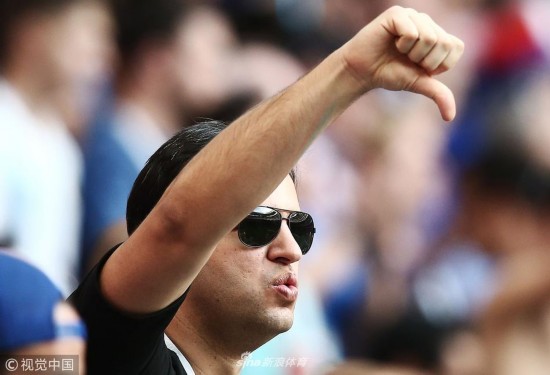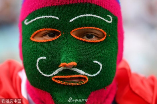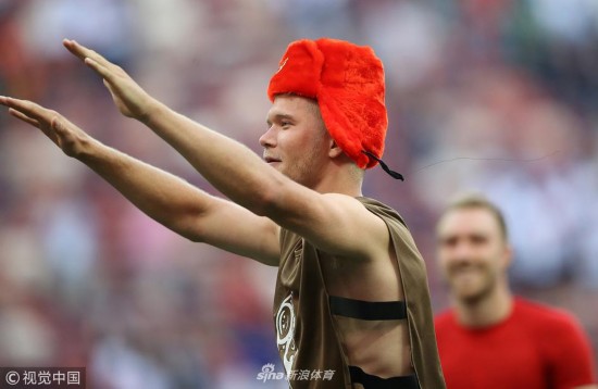 2018年6月26日,俄罗斯莫斯科,2018俄罗斯世界杯小组赛C组,丹麦Vs法国。 球迷做手势 MOSCOW, RUSSIA - JUNE 26, 2018: A football fan in a 2018 FIFA World Cup Group C Round 3 match between Denmark and France at Luzhniki Stadium; the teams drew 0-0. Valery Sharifulin/TASS