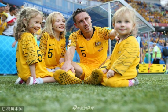 2018年6月26日,俄罗斯索契,2018俄罗斯世界杯小组赛C组,澳大利亚0-2秘鲁。 SOCHI, RUSSIA - JUNE 26: Mark Milligan of Australia speaks with his children after the 2018 FIFA World Cup Russia group C match between Australia and Peru at Fisht Stadium on June 26, 2018 in Sochi, Russia. (Photo by Simon Hofmann - FIFA/FIFA via Getty Images)