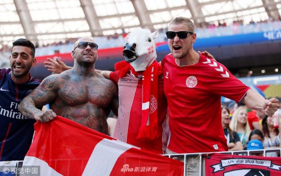 2018年6月26日,俄罗斯莫斯科,2018俄罗斯世界杯小组赛C组,丹麦Vs法国,球迷观战助威。 Soccer Football - World Cup - Group C - Denmark vs France - Luzhniki Stadium, Moscow, Russia - June 26, 2018 Denmark fans during the match Maxim Shemetov