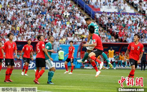 图为双方争抢球权。 在世界杯历史上,德国参加世界杯首轮小组赛还没有被淘汰过,但卫冕冠军小组赛在下届世界杯无法小组出线的“世界杯魔咒”也是德国队头上挥之不去的梦魇。德国曾5次对阵亚洲球队,全部取得了胜利。两队在世界杯上曾有两次交手,94年美国世界杯德国队3:2击败韩国,2002年韩日世界杯,德国队在半决赛中1:0击败东道主韩国队。 本场首发阵容中,卫冕冠军有所变化,轮换了5名球员。上一场比赛中领到红牌的博阿滕停赛,鼻骨骨折的鲁迪缺阵。胡梅尔斯伤愈复出,厄齐尔和赫迪拉重回首发,聚勒取代吕迪格,格雷茨卡也得到出场机会,前两场表现可圈可点穆勒和德拉克斯勒坐上了替补。 韩国队队长寄诚庸在此前的比赛中受伤,缺席本场比赛,韩国明星球员孙兴民戴上了队长袖标。韩国队阵容中,孙兴民和具滋哲都曾在德甲联赛效力,他们对德国球员的特点和比赛方式都非常熟悉,属于的“知德派球员”。 比赛一开始,两边即展开角逐,德国队逐渐掌控局面,在中前场展开攻势。韩国队在小组赛前两场比赛中共犯规47次,这场比赛势必也是一场刺刀见血的较量。第8分钟,韩国队15号郑又荣飞铲赫克托吃到黄牌。 第18分钟,韩国队前场获得任意球机会,郑又荣主罚直接任意球重炮攻门,德国门将诺伊尔扑球脱手,孙兴民快速插上门前包抄,但被诺伊尔抢先一步破坏出了底线。 第22分钟,韩国队李在成铲倒格雷兹卡,吃到黄牌。紧接着2分钟以后,韩国队传中,德国队解围不远,孙兴民在禁区内抢到第二落点,一脚势大力沉的凌空抽射,足球偏出门框。 第39分钟,德国队开出角球,禁区内多次触球后,胡梅尔斯得球后转身打门,但被韩国队门将化解。 上半场比赛结束,韩国队0:0战平德国队。纵观上半场比赛,德国队掌握场面主动并多次制造射门机会,但都错失良机。反观韩国队,虽然场面被动但反击极具威胁,德国队球门多次出现险情,但多次犯规与2张黄牌也为韩国队敲响警钟。 下半场易边再战,德国队门前制造绝佳机会,基米西右路传中,格雷兹卡头球攻门,但射门较正,被韩国队门将赵贤祐飞身扑出,这球是德国队至今最好的机会,比分依然是0:0。