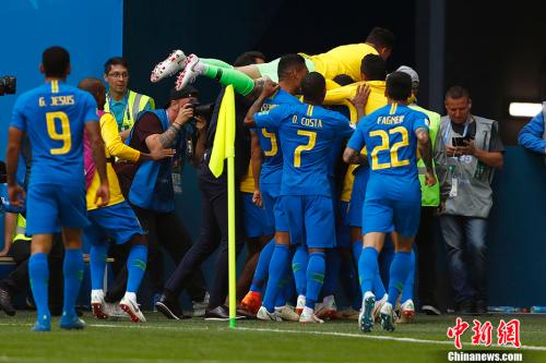 巴西队庆祝胜利,画面之外,主帅蒂特却意外抢戏。中新社记者 富田 摄