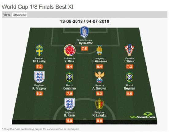 附《Whoscored.com》世界杯小组赛最佳阵容名单: