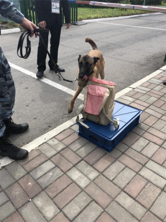 俄罗斯驻地警犬安检 虽然采访世界杯的媒体是可以进入圆湖基地,但同样有限制时间,他们只在俄罗斯队公开训练的时间对媒体开放,球队的公开训练时间每天在11点半开始,训练之后会有两个球员的采访,采访之后,基地只对媒体开放到下午两点,两点之后全部清场,任何媒体都不能在这里停留。这也是为了保护整个圆湖基地的安全问题。