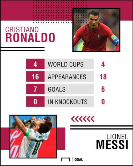 或许是在俱乐部层面的发挥太过于耀眼,在国家队比赛当中他们的表现并不算那么的完美。尤其是在世界杯的舞台上,C罗和梅西都已经4次参加这项足球盛事。只不过,他们二人在淘汰赛当中的进球数,现在都还依旧为零。