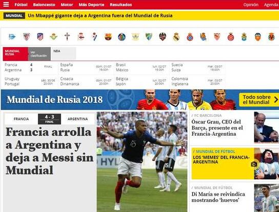 媒体都对阿根廷出局有些遗憾 阿根廷TYC体育的标题是“梦想结束”。 阿根廷《奥莱报》的标题是“梦想变成噩梦。” 阿根廷《号角报》的标题是“阿根廷遭法国打击淘汰,留下可悲形象。” 法国《队报》打出了“非常好”的标题。显然,法国队的表现让本国媒体充满信心。 《法国足球》的标题是“姆巴佩表现令人不可置信,法国淘汰阿根廷晋级”。 《雅虎体育》撰文称:“梅西永远无法赢得世界杯了。” (塞尔吉奥) |