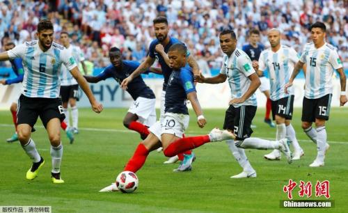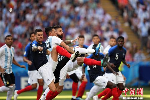 法国队凭借着格列兹曼、姆巴佩、帕瓦尔的进球,4:3淘汰阿根廷挺进8强。 中新社记者 田博川 摄