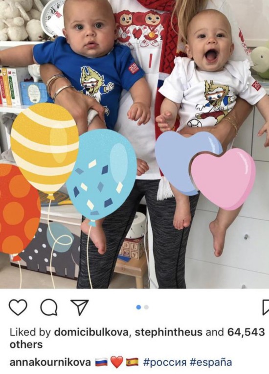 库娃的双胞胎 北京时间7月2日消息 昨天的俄罗斯世界杯1/8决赛,俄罗斯点球5-4淘汰了西班牙,克罗地亚点球4-3险胜丹麦。网坛众将也在关注这两场比赛,包括莎拉波娃、库尔尼科娃和沃兹尼亚奇等人。 俄罗斯美女库尔尼科娃在社交网络上晒出了他和西班牙情歌王子安立奎的双胞胎,一张照片是穿着俄罗斯特色的衣服,另一张则穿着西班牙队的球员。