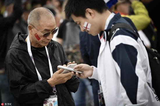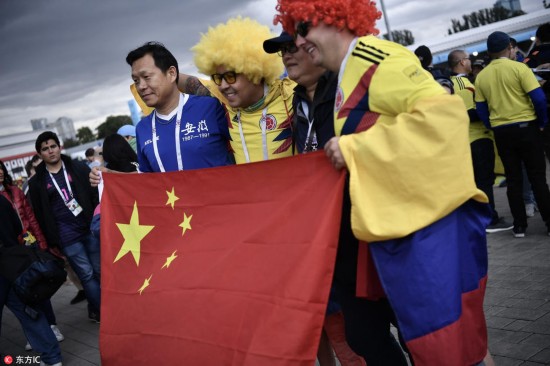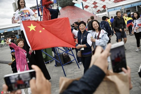 腾讯体育讯 当地时间2018年7月3日,俄罗斯莫斯科,斯巴达克球场外球迷狂欢,大批中国球迷观看比赛。